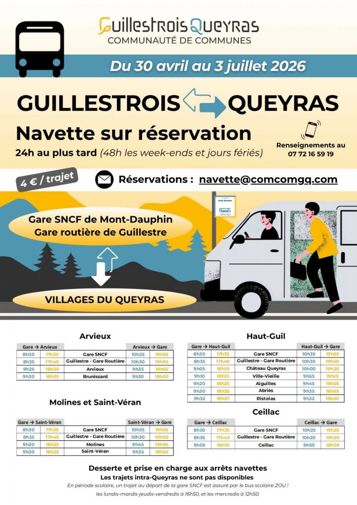 A compter du 30 avril 2026 et jusqu’au 3 juillet, c’est reparti pour la navette reliant la gare SNCF de Mont-Dauphin et/ou la gare routière de Guillestre aux villages du Queyras et ce, dans les 2 sens, matin et soir.